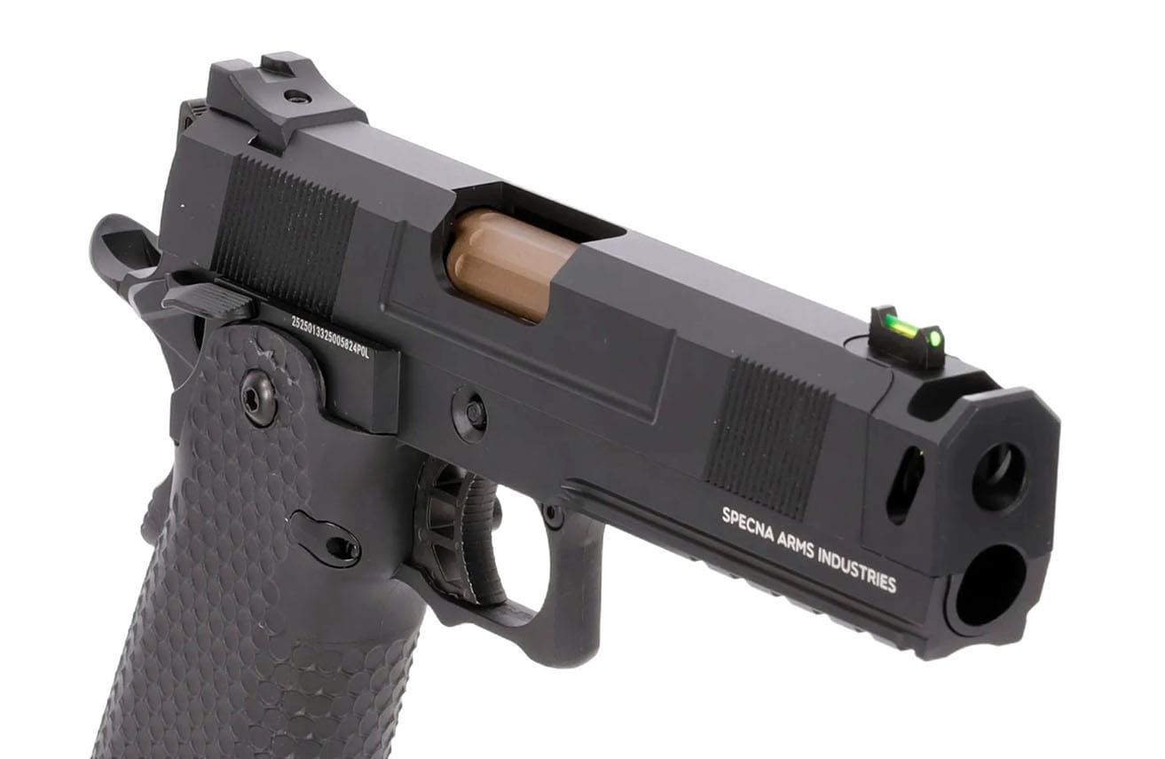 Naujas išskirtinis airsoft pistoletas Specna Arms VAPOR - modernaus ypatingo dizaino su kompensatoriumi, pilnai metalinis, judančia spyna. Sunkus, solidus ir patogus. Perkant iškart gausite 2 dėtuves!