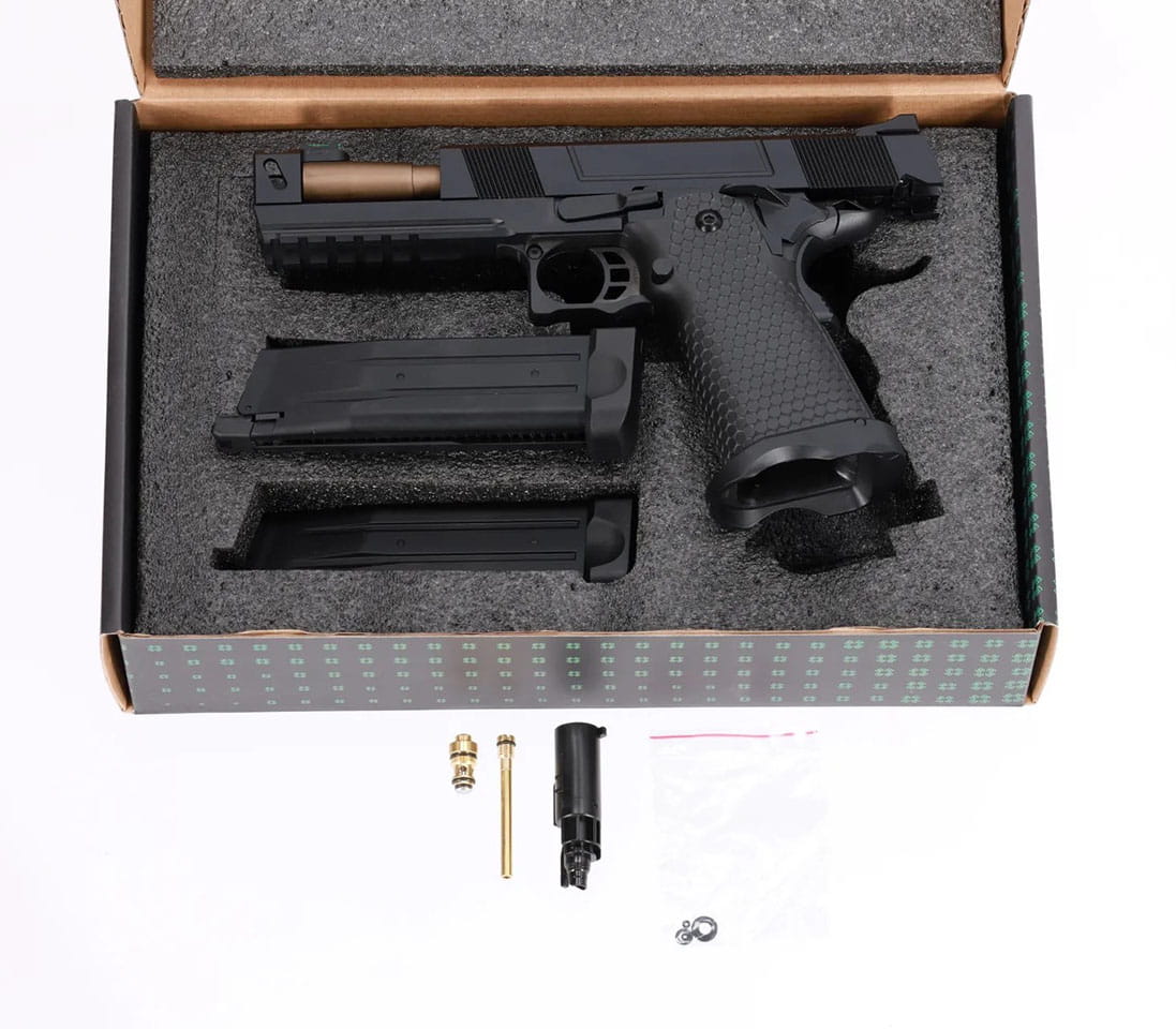 Pistoleto korpusas pagamintas iš metalo, tai Colt M1911 tipo pistoletas, turintis 2 veikiančius saugiklius, taip pat povamzdinį pabėgį priedų montavimui, pluoštinės optikos taikiklį (lengva taikytis net prieblandoje, jis švyti). Šaudant vaikšto spyna, juntama tikroviška atatranka. Ergonomiškas pistoletas - ypač patogi rankena (neslystanti tekstūra) ir nuleistukas, patogu įdėti dėtuvę.